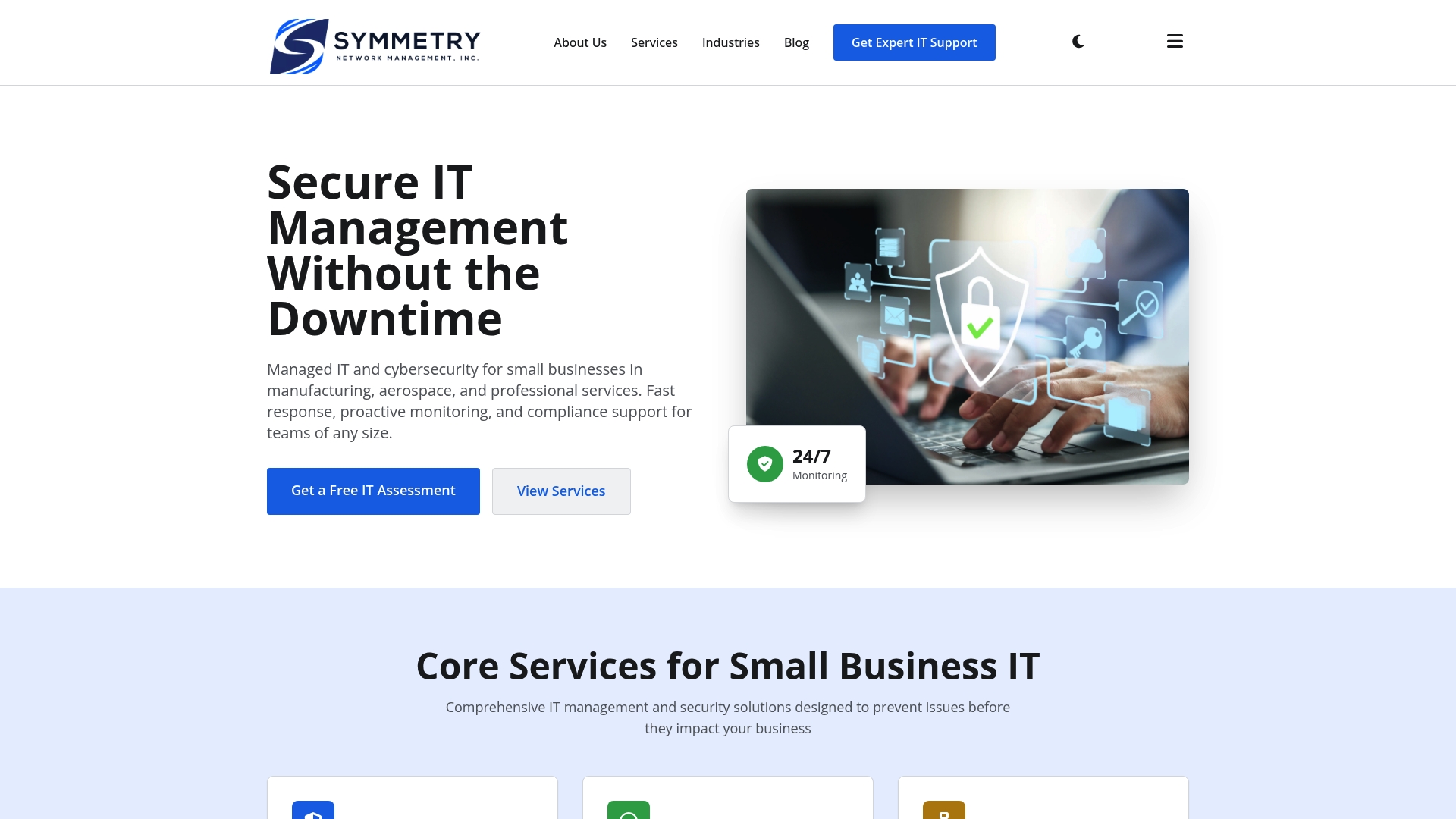 Take control of your IT environment today by visiting Symmetry Network Management for a free assessment. Find out how our expertise in manufacturing and aerospace IT compliance can safeguard your business and create peace of mind. Don’t wait until downtime or compliance gaps affect your growth—partner with Symmetry now to secure your infrastructure with confidence.